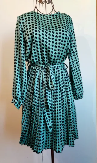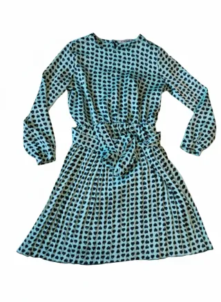 Elegante abito con fantasia di cuori. - Maniche lunghe. - Cintura in vita con fiocco. - Gonna a pieghe. -In ottimo stato pari al nuovo particolari e misure in foto taglia unica veste tranquillamente fino a una taglia 46 italiana