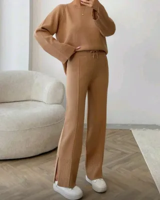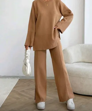 Elegante completo da donna. - Maglia a maniche lunghe con polsini a coste. - Pantaloni a gamba larga con spacchi laterali. - Tessuto morbido e confortevole.