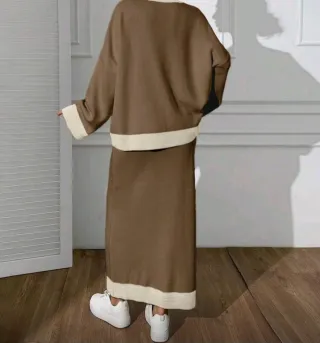 Elegante completo da donna composto da maglia e gonna. - Maglia a maniche lunghe con dettagli a contrasto. - Gonna lunga coordinata. - Tessuto morbido e confortevole.