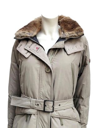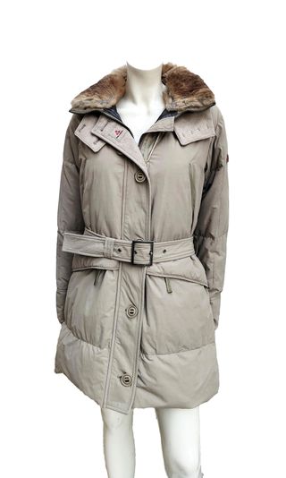 Peuterey Parka da donna modello Sceptre. Giaccone imbottito in piuma d'oca, morbida e calda. Colore neutro sui toni del kaki/tortora chiaro. Collo removibile in pelliccia di coniglio. Cappuccio foderato anche questo removibile. La taglia è una 44 italiana, corrisponde ad una Large internazionale. Le misure prese con il capo steso in piano sono: torace 54.5, spalle 41, maniche 64, lunghezza s 83.5 cm circa. Non ha rotture o difetti, non dico sia nuovo ma poco ci manca. E' bellissimo e molto caldo, non perdetelo!