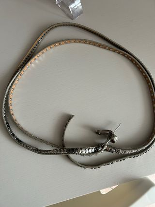 Elegante cintura con un design unico. - Dettagli con borchie lungo tutta la lunghezza. - Fibbia in metallo argentato. - Finitura bicolore.