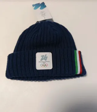 Berretto ufficiale per le Olimpiadi Invernali di Milano Cortina 2026. - Design a coste. - Patch con logo Milano Cortina 2026 e anelli olimpici. - Striscia tricolore italiana sul bordo.