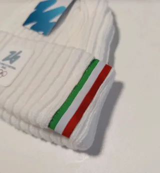 Berretto invernale con logo Milano Cortina 2026 e i cinque cerchi olimpici. - Design a coste. - Fascia con i colori della bandiera italiana. - Taglia unica.