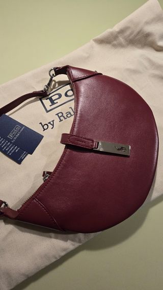 Borsa a mano in pelle di colore borgogna. - Design a mezzaluna. - Dettaglio con logo inciso. - Chiusura con zip. - Include dust bag originale.