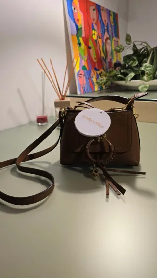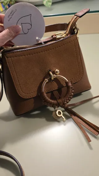 Piccola borsa a tracolla in pelle marrone. - Dettaglio con charm e nappine. - Chiusura con zip. - Tracolla regolabile.