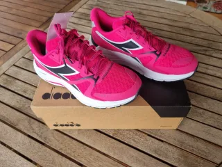 Scarpe da running Diadora Mythos 8 VORTICE. - Colore rosa vivace. - Dettagli bianchi e neri. - Suola bianca.