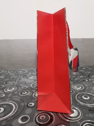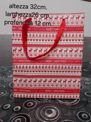 Borsa in cartone con fantasia natalizia. Usata una volta a segni di una pindarici verso l'alto vedi foto - Altezza: 32 cm - Larghezza: 26 cm - Profondità: 12 cm