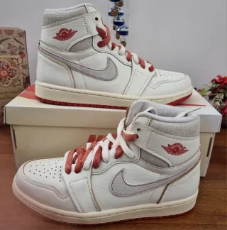 Scarpe Nike Air Jordan 1. PER LE SPECIFICHE ULTIMA FOTO!!! - Tomaia in pelle bianca. - Dettagli rossi e grigi. - Suola in gomma. - Design unisex.