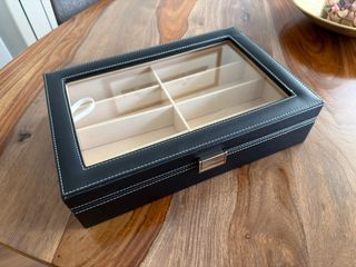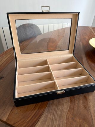 Scatola elegante per riporre gli occhiali. Il design permette di tenerli in ordine e a portata di vista. - Esterno in similpelle nera. - Interno rivestito in beige. - Coperchio con finestra in vetro. - Scomparti interni.