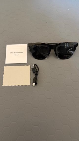 In vendita occhiali intelligenti in colore nero. Includono manuale utente, panno pulizia e cavo USB. Design moderno ed elegante. Lenti scure per protezione solare.