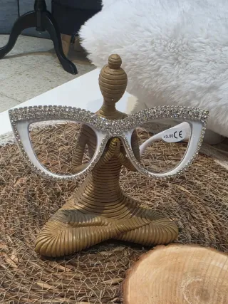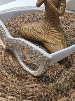 Occhiali da lettura eleganti con un design accattivante. - Montatura bianca decorata con strass. - Lenti con graduazione +3.00. - Certificato CE.