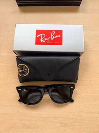 In vendita occhiali da sole Ray-Ban modello Wayfarer neri. Include custodia protettiva e scatola originale.