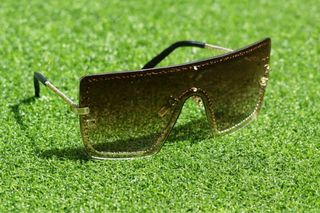Occhiali da sole eleganti con montatura dorata e lenti sfumate in tonalità marroni. - Montatura metallica dorata. - Lenti con protezione UV 100%.