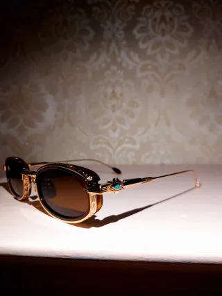 Occhiali da sole Jacques Marie Mage con montatura color oro e lenti marroni. Ottima alternativa per chi non vuole spendere tantissimo per un paio di occhiali costosi. Nuovi compresi di tutto senza cartellino. - Dettagli in oro sulla montatura. - Lenti con sfumatura marrone. - Design unico e distintivo.