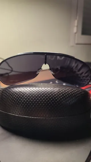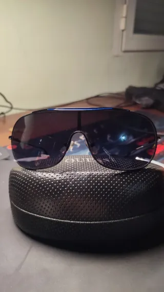 Occhiali da sole con montatura nera e lenti sfumate in tono blu. Un accessorio moderno ed elegante principalmente per uomo, anche se possono essere unisex. - Montatura nera. - Lenti con effetto sfumato blu. - Design elegante da indossare sia di giorno che di notte. - Mai usati, arrivano nella loro confezione originale. - Di buon materiale. - Spedizione disponibile.