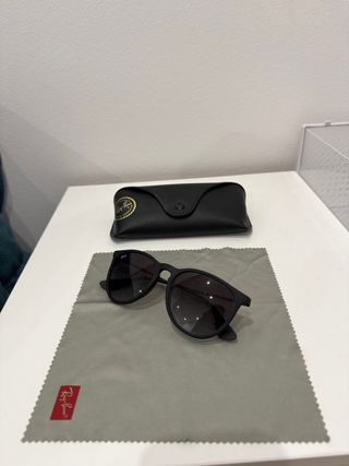 Occhiali da sole Ray-Ban con montatura nera. - Includono custodia protettiva. - Panno di pulizia in microfibra con logo.
