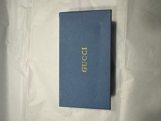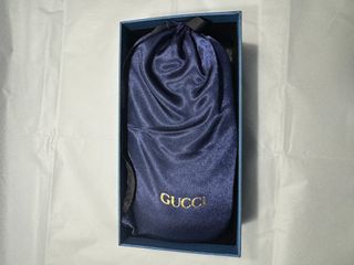 Set di occhiali da sole Gucci con custodia e scatola. - Montatura nera. - Lenti con tonalità bluastra. - Include custodia protettiva in tessuto blu. - Scatola originale di presentazione.