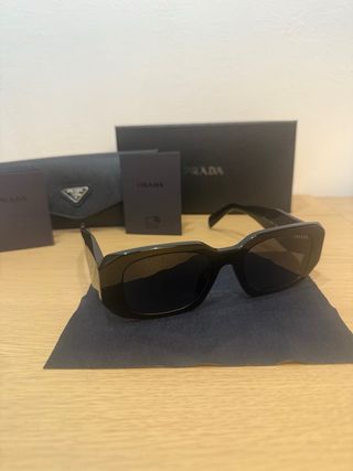 Occhiali da sole Prada con montatura nera. - Montatura squadrata. - Lenti scure. - Custodia inclusa.