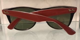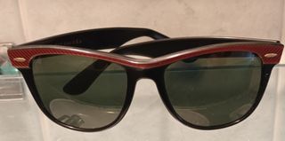 Occhiali da sole Ray-Ban con montatura nera e dettagli rossi. - Montatura in acetato. - Lenti verde scuro - Dettagli dorati sulle aste.