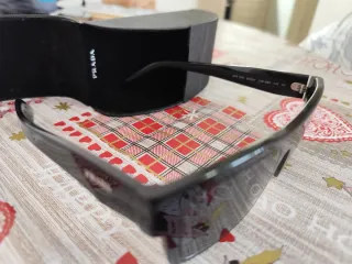Occhiali da sole Prada dal design moderno e sportivo. Le lenti sono rovinate e mancano I naselli. - Montatura nera. - Lenti verdi. - Logo Prada sulle aste.
