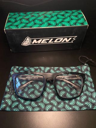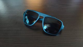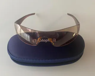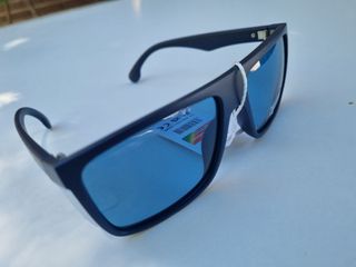 Occhiali da sole con montatura blu e lenti blu specchiate. Mai usati. - Stile moderno. - Include custodia protettiva.