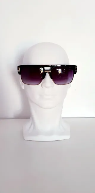 Occhiali da sole Versace da uomo, un accessorio elegante e distintivo. - Montatura in colore nero. - Dettagli dorati. - Include astuccio originale.