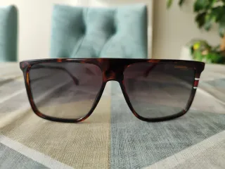 Occhiali da sole del marchio Carrera per uomo. Design moderno ed elegante. - Montatura con finitura tartaruga. - Lenti sfumate in tonalità grigia. - Dettagli sui lati.