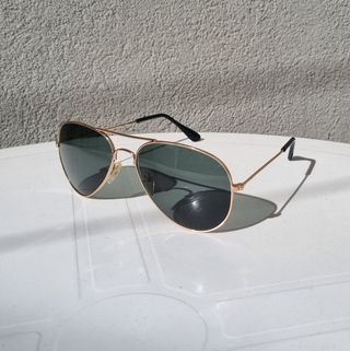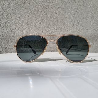 Occhiali da sole aviator firmati Ray-Ban by Luxottica, espressione autentica dello stile iconico degli anni '80. Caratteristiche: ►Brand: Ray-Ban by Luxottica ►Anni / periodo: anni '80 ►Modello: Aviator classico ►Materiale montatura: Metallo ►Colore montatura: Oro / gold ►Colore lenti: Grigio-verde ►Design / forma: Aviator, doppio ponte, aste sottili con terminali neri ►Genere: Unisex ►Misure: Asta 135 mm | Larghezza totale 135 mm | Lente 50 x 43 mm | Ponte 17 mm Condizioni: Ottimo stato. In dotazione: Custodia originale Ray-Ban in ecopelle nera. La montatura presenta il marchio Ray-Ban impresso sull'asta e sul ponte.