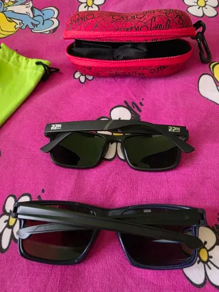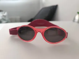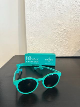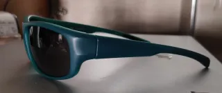 Occhiali da sole per bambini con gomma per fissarli alla testa, quasi nuovi, in perfette condizioni. - Montatura verde. - Lenti nere. - Design leggero e comodo. Posso portarli a Madrid o paesi del sud della Comunità.