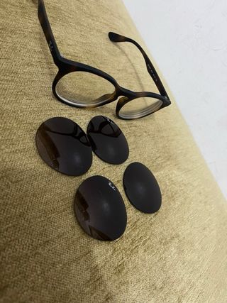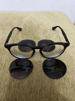 Occhiali da sole Ray-Ban con montatura marrone e design moderno. Includono lenti intercambiabili per adattarsi a diverse condizioni di luce. - Montatura in acetato. - Lenti con protezione UV. - Includono due paia di lenti aggiuntive.