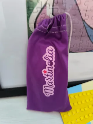 Occhiali da sole per bambini con un design divertente. - Custodia viola con cordoncino. - Dettaglio del nome Martinelia sulla custodia.