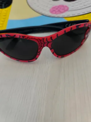 Occhiali da sole per bambini con un divertente design ispirato a Spiderman. Perfetti per proteggere i loro occhi dal sole con stile. - Montatura rossa con dettagli di ragnatela. - Lenti scure.