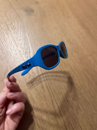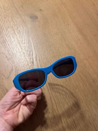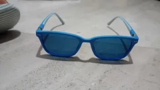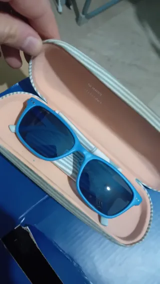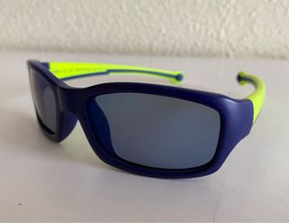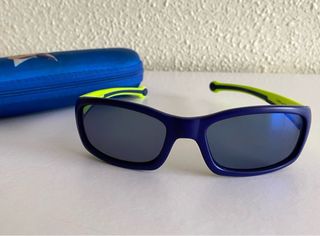 Occhiali da sole per bambini, in colore blu con aste pieghevoli verde pistacchio per evitare che si rompano. Include custodia con cerniera. Acquistati in un'ottica.