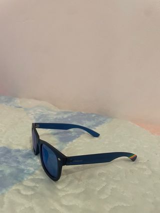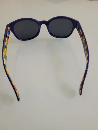 Occhiali da sole polarizzati per bambini con un design divertente. Usati 1 volta. - Montatura blu. - Dettaglio con motivo multicolor sulle aste.