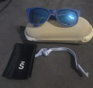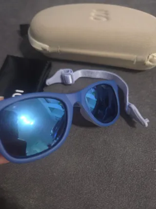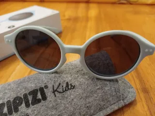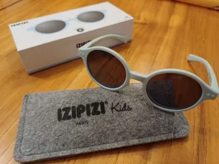 Occhiali da sole per bambini del marchio Izipizi. Include custodia. - Montatura di colore blu chiaro. - Lenti di colore marrone. - con cinturino di fissaggio. In buone condizioni.