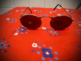 Occhiali da sole con lenti rotonde e montatura metallica. - Lenti di colore rosso. - Montatura color marrone.