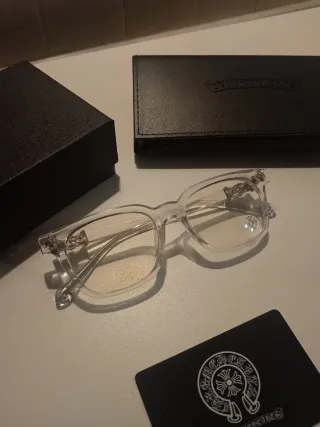 Occhiali da vista Chrome Hearts con dettagli in argento. - Montatura trasparente. - Dettagli decorativi sulle aste. - non Include custodia e scatola. - nessun simbolo sulla lente.