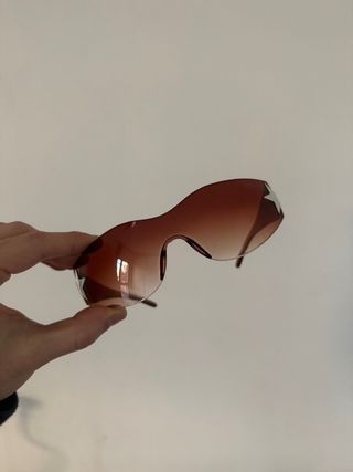 Occhiali da sole vintage con montatura color beige e dettagli rosa. - Montatura in acetato. - Lenti con sfumatura rosa. - Design oversize. Le lenti sono graffiate, da sostituire. presenti Segni d’uso!!