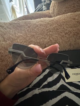 Occhiali da sole Fendi con montatura color argento e lenti grigie. - Design moderno e raffinato. - Dettagli geometrici sulle aste.
