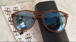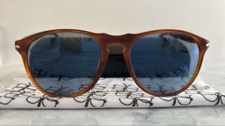 Occhiali da sole Persol con lenti azzurre e montatura tartarugata. - Montatura in acetato marrone. - Lenti con finitura blu. - Modello unisex.