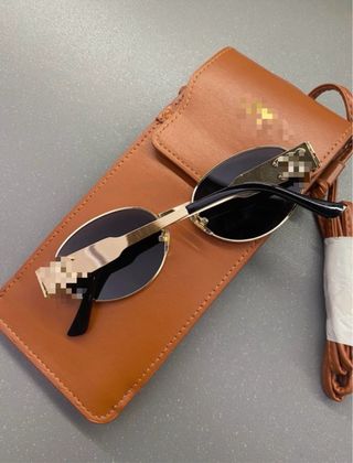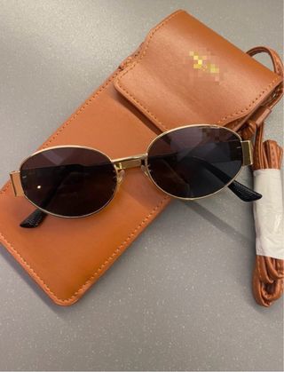 Eleganti occhiali da sole con montatura dorata e lenti scure, completi di porta occhiali in ecopelle color cuoio e tracolla abbinata. - Montatura metallica color oro. - Porta occhiali in ecopelle.