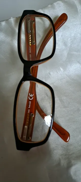 Occhiali da vista Timberland con montatura bicolore. - Colore montatura: nero e arancione. rifiniture in pelle vera - Misura ponte: 17. - Lunghezza aste: 140. - Colore lenti: trasparente.