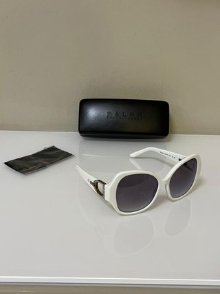 Eleganti occhiali da sole Ralph Lauren con montatura bianca e lenti sfumate. - Montatura bianca. - Lenti grigie sfumate. - Dettagli decorativi sui lati.