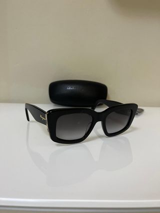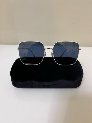 Occhiali da sole Dior con montatura color oro e lenti scure. Inclusa custodia rigida con logo Gucci e panno per la pulizia. - Montatura metallica color oro. - Lenti con finitura scura. - Custodia rigida blu. - Panno per la pulizia con logo Gucci.