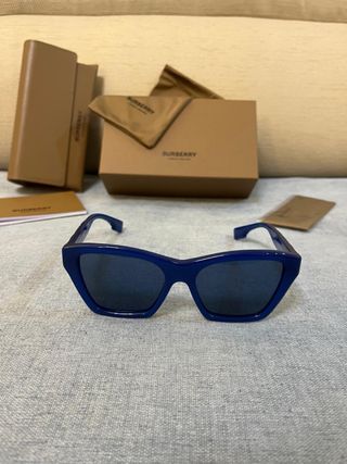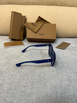 Occhiali da sole Burberry con montatura blu. - Lenti scure. - Custodia rigida inclusa. - Panno per la pulizia.