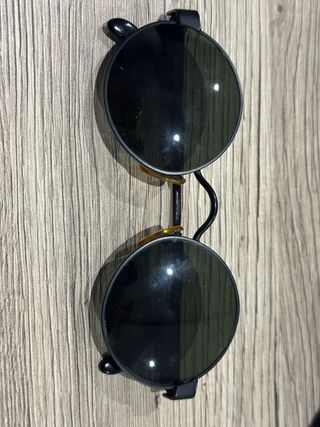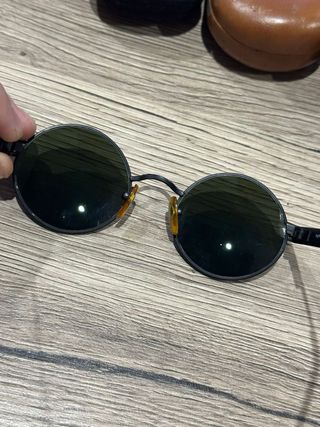 Occhiali da sole vintage del marchio Biblos. Sono un paio di occhiali rotondi, con montatura nera e lenti scure. Perfetti per un look retrò! - Montatura in metallo resistente. - Lenti in buone condizioni.