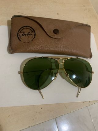 Occhiali da sole Ray-Ban modello Aviator con montatura color oro e lenti verdi. Inclusa custodia originale. - Montatura in metallo dorato. - Lenti verdi. - Custodia in pelle marrone con logo Ray-Ban. Occhiali Ray-Ban B&L Shooter Aviator vintage '60 stecche a ricciolo lenti serigrafate B&L.