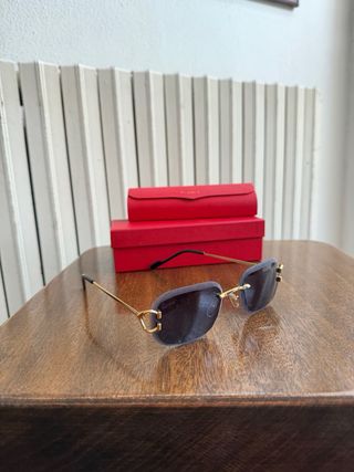 Eleganti occhiali da sole con montatura color oro e lenti sfumate e sfaccettate, taglio diamantato - Dettagli iconici del brand. - Design sofisticato. Complete di astuccio rosso
