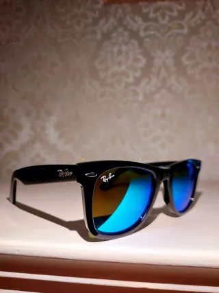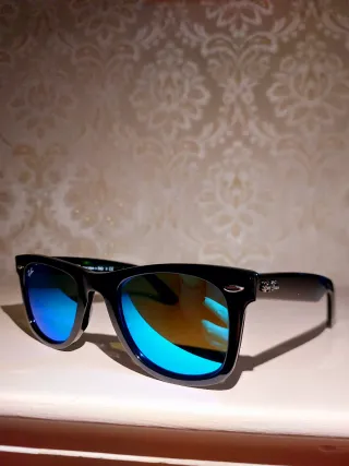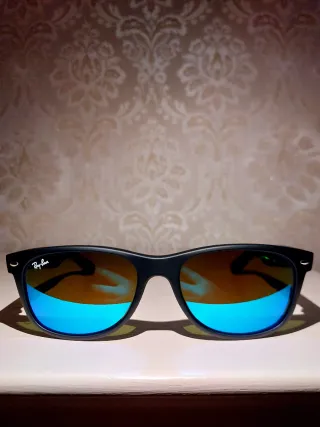 Iconici occhiali da sole Ray-Ban Wayfarer. Nuovi compresi di tutto. - Montatura nera. - Lenti con trattamento a specchio blu. - Logo Ray-Ban sulle aste.