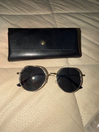 Occhiali da sole con montatura dorata e lenti nere. - Montatura metallica color oro. - Lenti scure. - Custodia nera inclusa.